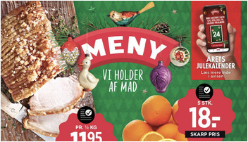 Meny tilbyder flæskesteg af dansk gris, ridses og med ben, til en pris på 11,95 kr. pr. ½ kg. Kiloprisen er 23,90 kr. Dette tilbud gælder fra fredag den 12. december til torsdag den 18. december.